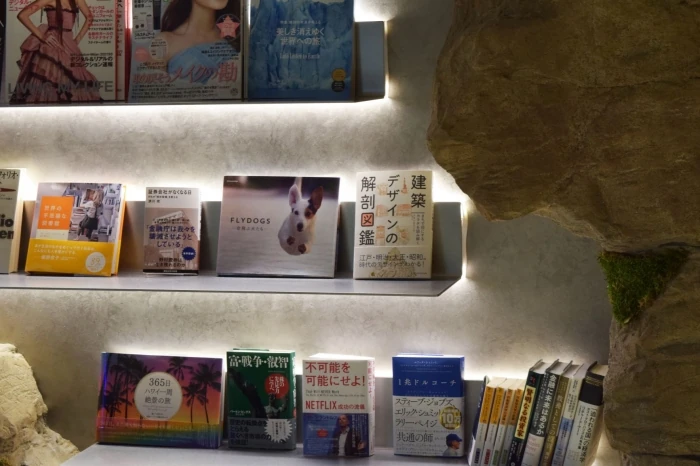 フリースペースの奥には、存在感のある本棚があります。岩の割れ目から出てきたようなイメージです。間接照明により、本棚一段一段が浮いているように見えるのも面白いですね!デザイナーのこだわりが感じられる本棚です。