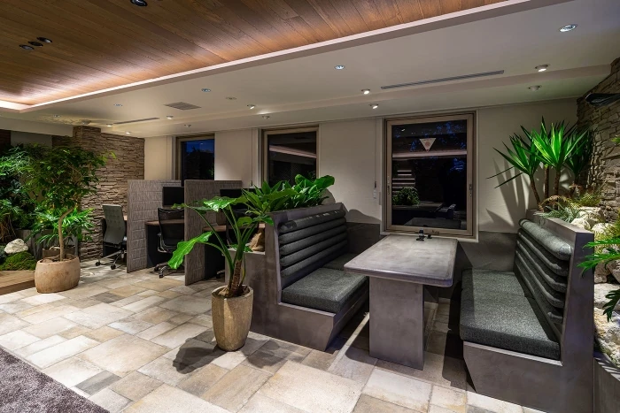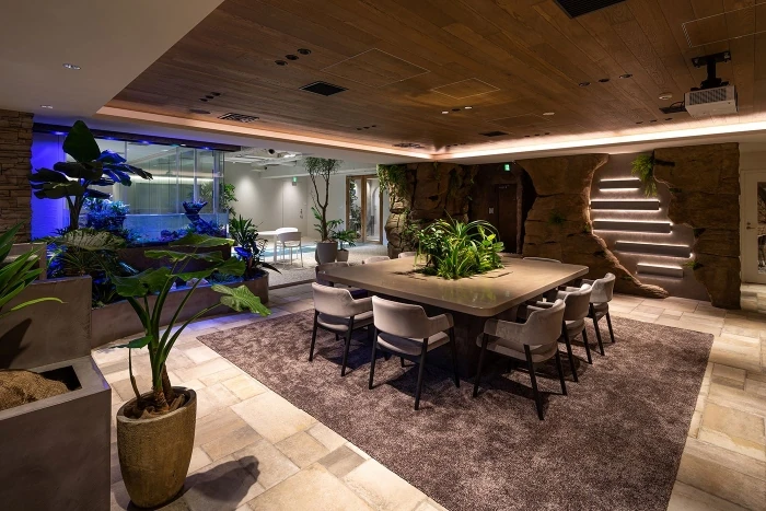 白の家具やグリーンとのコントラストにより、海やリゾートのような雰囲気を感じられる空間となっています。昼間と夜間とで照明を変えることができ、全く違った表情を演出します。スケルトンの天井により、空間がより広く感じられます。