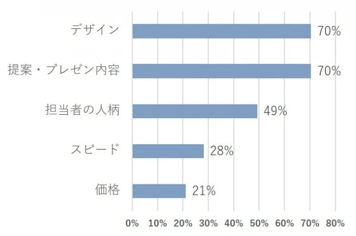 ヴィスを選んだ理由として、「デザイン」、「提案・プレゼン内容」が多いのは以前と変わらない傾向ですが、前回どちらも60%程度だったのに対し今回は70%と増加しました。