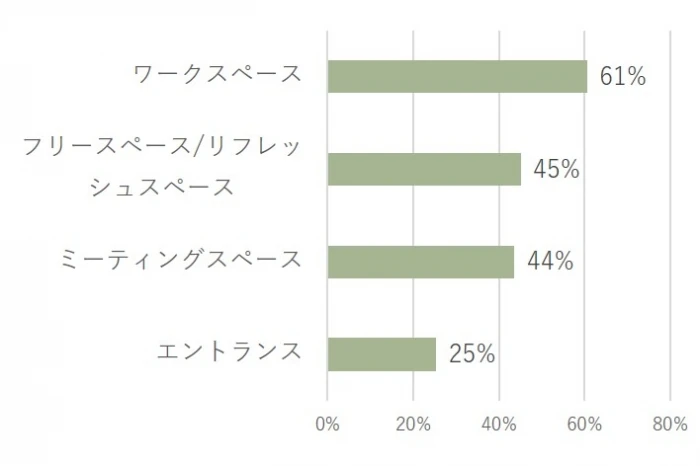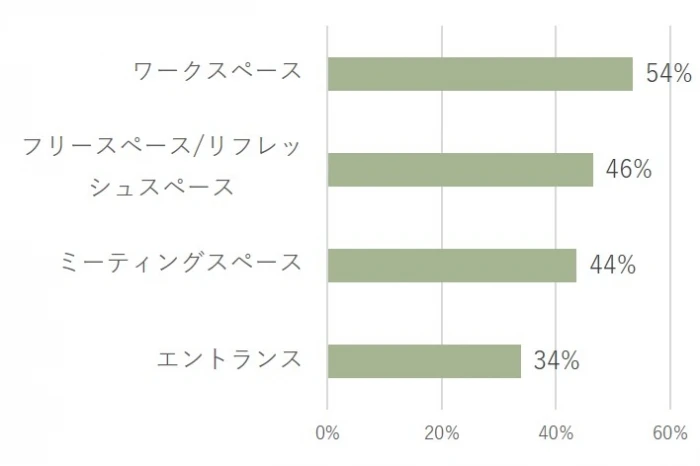 以前より「フリースペース/リフレッシュスペース」の評判が最もよい傾向が続いていましたが、今回は「ワークスペース」が54%と最も多い結果となりました。