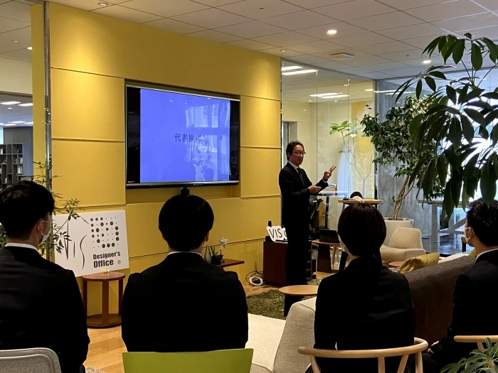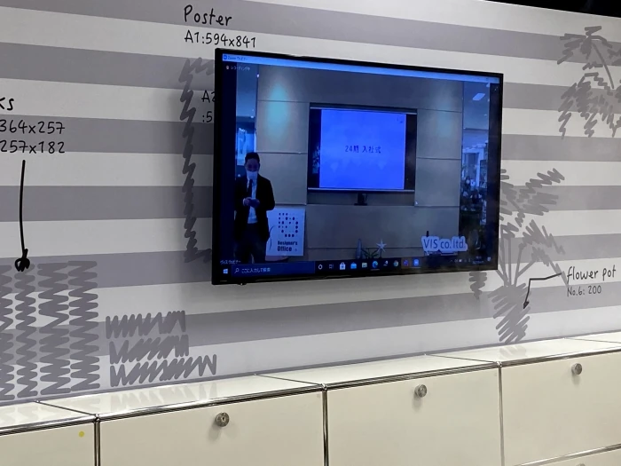 例年、入社式も社員総会と同日に開催し、大きな会場で全社員で新入社員をお迎えするのですが、昨年に続き今年も感染症予防のためオフィス内で場所を分け、オンラインと併用しての開催となりました。