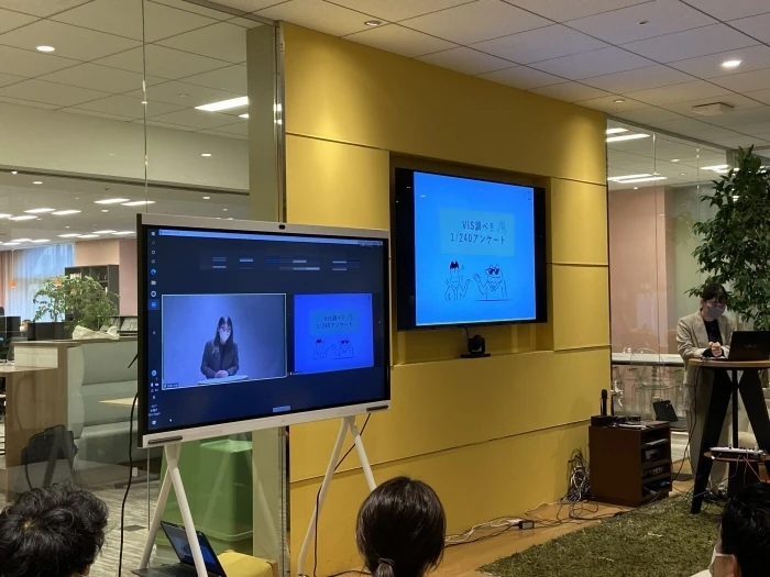 昨年は内定者も自宅から参加のオンライン内定式でしたが、今年は内定者はオフィス(東京、大阪)に来社、ヴィスメンバーはオフィス出社とテレワークでのオンライン参加と、ハイブリッド内定式を開催することになりました!