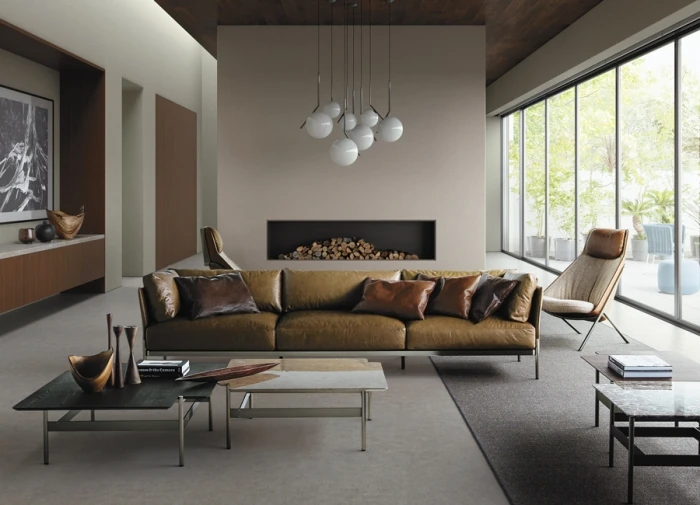 ふくよかなクッションとシャープな脚部のコントラストが特徴のソファ。