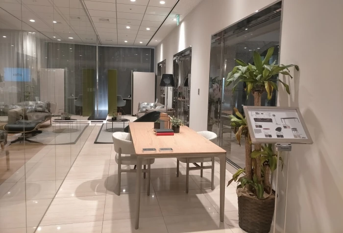 東京オフィスのエントランスでは、家具メーカー様ご協力のもと、家具を月替わりで展示しています。2021年11月から12月は、株式会社 アルフレックス ジャパン様にご協力いただいております。