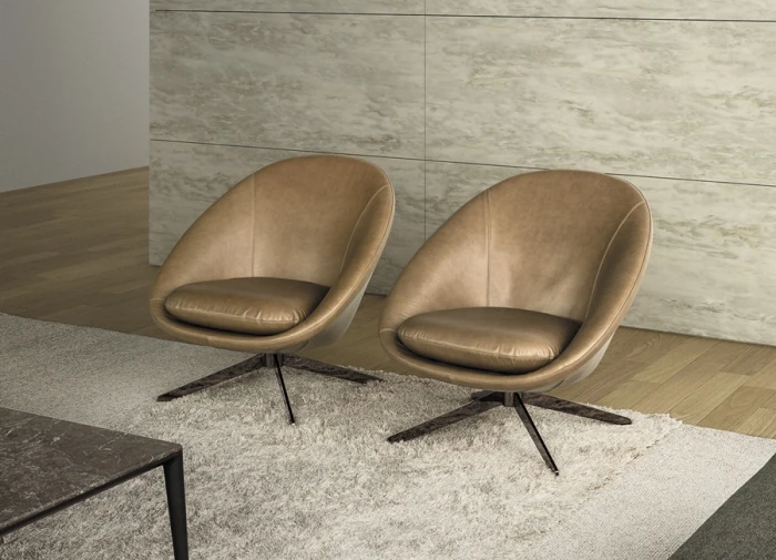 優雅さと量感を併せ持つチェアLYSは、大ぶりな馬蹄形の背が身体をホールドし、快適な座り心地をもたらします。