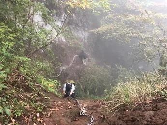 澄んだ空気と緑の美しさに心を落ちつかせていると、「ギャー」と悲鳴が! 後ろを振り返ると、黒田隊員の足にヒルが!!