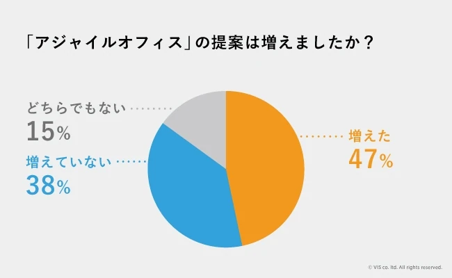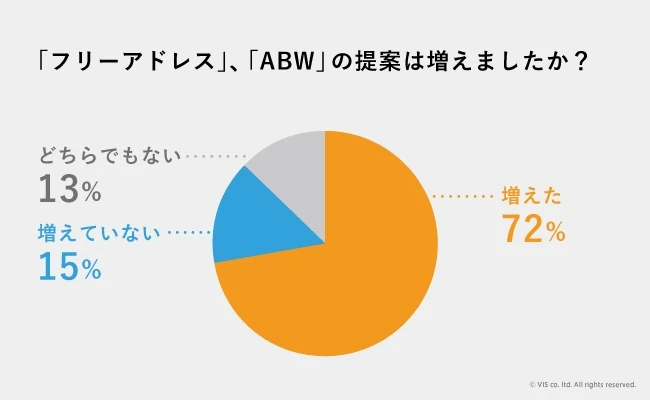 「フリーアドレス」や「ABW」の提案は「増えた」が72%。以前から増加傾向にあり、今年もさらに増加しています。