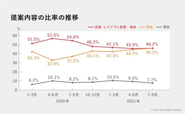 2021年は、新型コロナウイルスの影響が落ち着き、オフィス移転の割合は増加傾向にあります。2021年7〜9月には、移転と改装(レイアウト変更・増床含む)は同割合になっています。