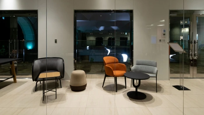 東京オフィスのエントランスでは、家具メーカー様ご協力のもと、家具を月替わりで展示しています。2022年5月からは、株式会社アダル様にご協力いただいております。