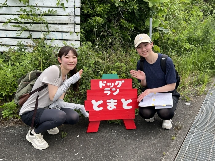 ※Twitterを頑張っている2人です。トマト好きと犬好きのためこの看板で写真を撮りました。