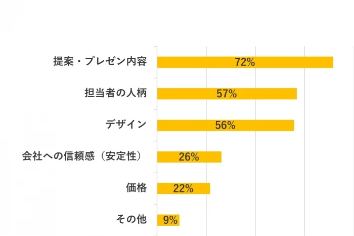 「提案・プレゼン内容」が72%で最も多く、「担当者の人柄」が57%、「デザイン」が56%で続きました。