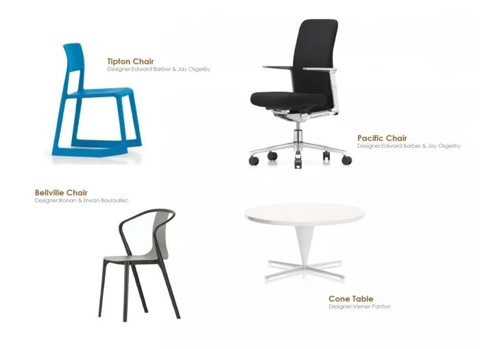 その他にも、会議室やフリースペースに大人気の「Tipton Chair」や、クリエイティブな人たちが集うビストロ、バー、カフェで賑わっているパリの地域の名前が付けられた「Bellville Chair」など、ヴィトラ社の人気のプロダクトが揃っております。