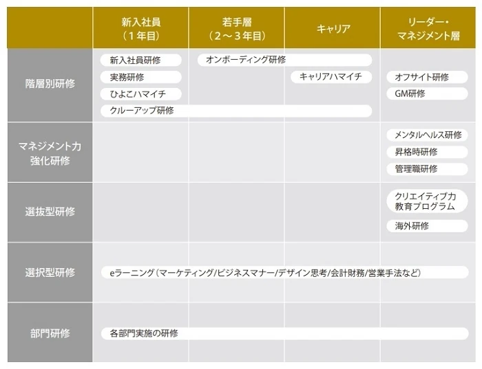 新入社員1-3年目を対象とした研修。ビジネスマナー・マインドセット等も含む3年間の長期カリキュラムです。