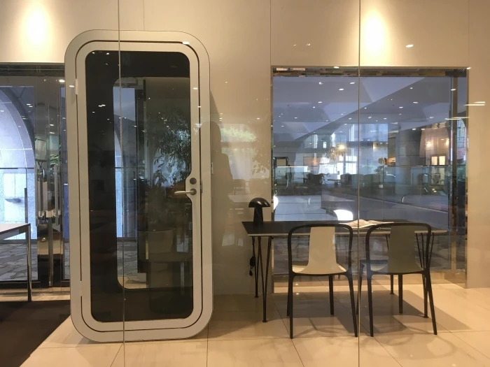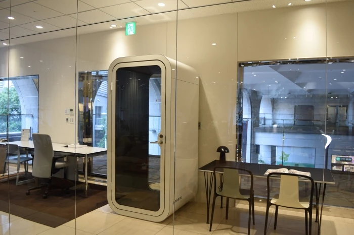 エントランスでもひときわ目立つ「Framery O」は、防音ワークスペース。この中に入ることで周囲の音が遮断でき、話をしていてもワークスペースにはお互いに影響がありません。周りの音を気にせずに話せるので、電話やテレビ会議でも大活躍。