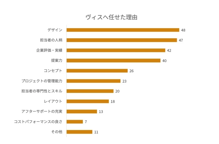 「デザイン」が最も多く、次いで「担当者の人柄」「企業評価・実績」という結果になりました。ヴィスは社員の約25%がデザイナーです。デザイナーもプロジェクトごとにアサインされ、ヒアリングから提案、完工まで伴走しています。お客様が抱える課題や想いをデザイナーが直で汲みとり、お客様と一緒に新しいオフィスを設計していくというプロセスも大切なポイントなのではないでしょうか。