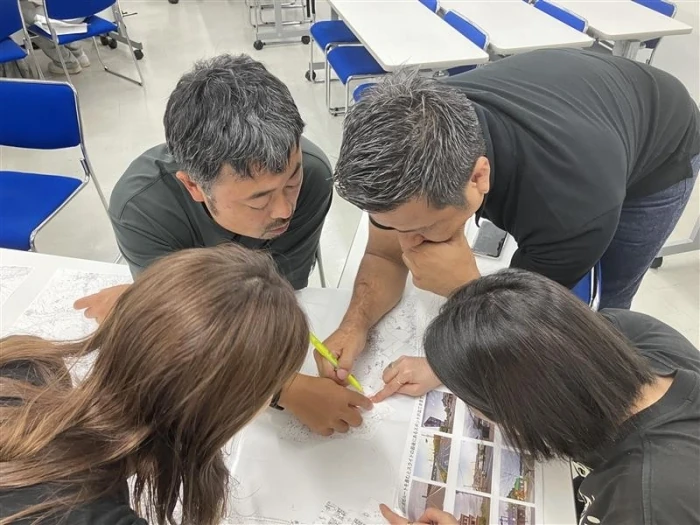 研修の終わりには、地図を見ながら明日の浜名湖一周のウォーキングルートを決めます。歩いている最中は電子機器に頼ってはならず、頼りになるのはこの地図だけ。