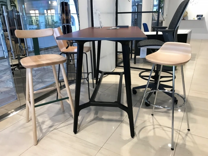 今回展示しているのはハイタイプのミーティングテーブル。スタンディングでのミーティングや作業、カフェコーナーとしての利用などができます。