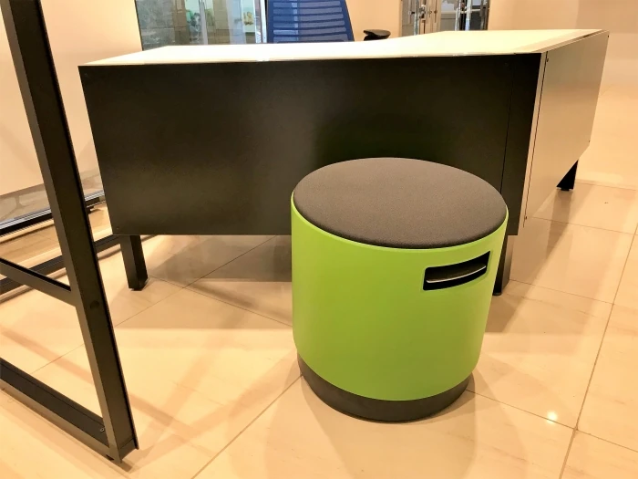 「ワサビグリーン」の丸いイスは、スチールケースの「turnstone Buoy(ターンストーン ブイ)」。