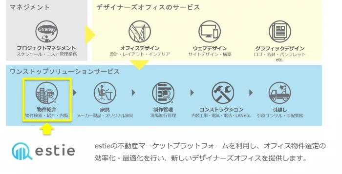 このウェブサイトを通して、オフィスデザインを検討するクライアントに対しより効率的で効果的なオフィス物件の紹介が可能になります。従来のオフィス物件紹介サービスに加え、estie(エスティ)が提供する大手不動産仲介会社が多数参加するオフィス探しプラットフォームを活用し、オフィス物件探しを効率化・最適化します。