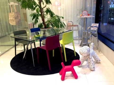 新作のシックな水玉模様「ダルメシアン」と、数量限定販売のMAGIS SHOP限定色「フクシアピンク」(Sサイズのみ)が、招き犬としてエントランスにドーンと構えております。