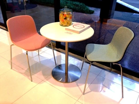 シンプルなデザインでどんな空間でも合わせやすいカフェテーブル。ステンレスフレームのマットな光沢がスタイリッシュで美しい。6種類のサイズと2色のカラーバリエーションから選択可能。