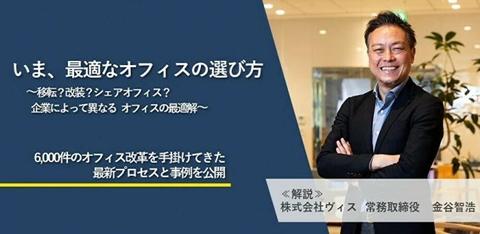 「いま、最適なオフィスの選び方 〜移転?改装?シェアオフィス? 企業によって異なるオフィスの最適解〜」というテーマで、オフィスが多様化する背景、最適なオフィスを導くためのプロセス、コロナ禍でオフィス見直しを意思決定した事例まで、ヴィス常務取締役 金谷が解説します。オフィスをどのように変革するべきかお悩みの方におすすめです。