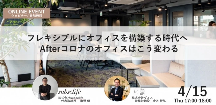 デザイナーズオフィス事業を手がける株式会社ヴィス(本社:大阪市北区、代表取締役社長:中村勇人)は、2021年4月15日(木)に、株式会社subsclife様と共催で無料オンラインセミナーを開催します。「フレキシブルにオフィスを構築する時代へ。Afterコロナのオフィスはこう変わる」というテーマで、afterコロナにおけるオフィス構築について対談形式でお話します。今後どのようにオフィス環境を整えるべきか迷っている方、フレキシブルなオフィス環境構築に関心のある方におすすめのセミナーです。