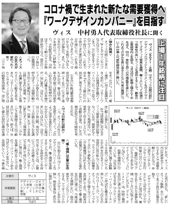 2021年4月9日付けの日本証券新聞「上場1年銘柄に注目」に、当社代表中村のインタビュー記事が掲載されました。