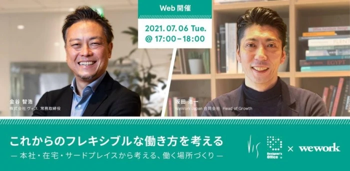 デザイナーズオフィス事業を手がけ、「はたらく」をデザインする株式会社ヴィス(本社:大阪市北区、代表取締役社長:中村勇人)は、2021年7月6日(火)に、WeWork Japan 合同会社と共催で無料オンラインセミナーを開催します。「これからのフレキシブルな働き方を考える」というテーマで、本社・在宅・サードプレイスそれぞれの場所を通して“働く場所づくり”について考えます。今までとは違うニューノーマルな時代に合う働き方に関心のある方、今後求められるオフィスの価値について考えたい方はぜひご参加ください!