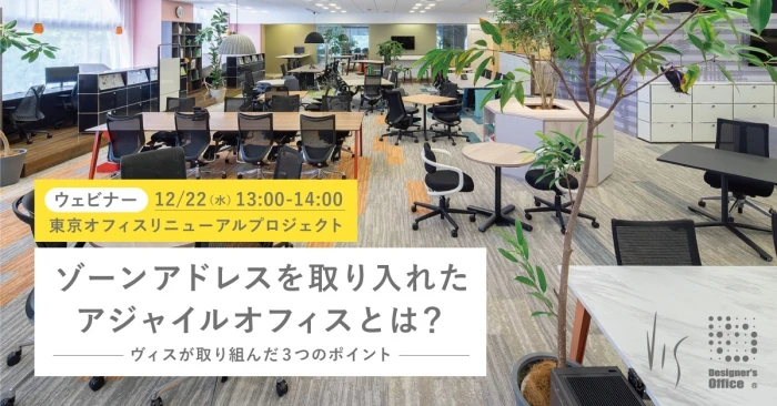 デザイナーズオフィス事業を手がけ、「はたらく」をデザインする株式会社ヴィス(本社:大阪市北区、代表取締役社長:中村勇人)は、2021年12月22日に、アフターコロナを見据えたオフィスのポイントを自社オフィスリニューアルを例に解説する無料オンラインセミナー「ゾーンアドレスを取り入れたアジャイルオフィスとは? 東京オフィスリニューアルで取り組んだ3つのポイント」を開催します。