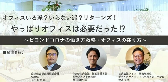 「オフィスでのリアルワークもリモートワークも重要!どちらもしっかり運用していきたい」とお考えのfreee株式会社様をゲストでお招きして、3社でビヨンドコロナの働き方・オフィスの在り方を徹底討論しました。