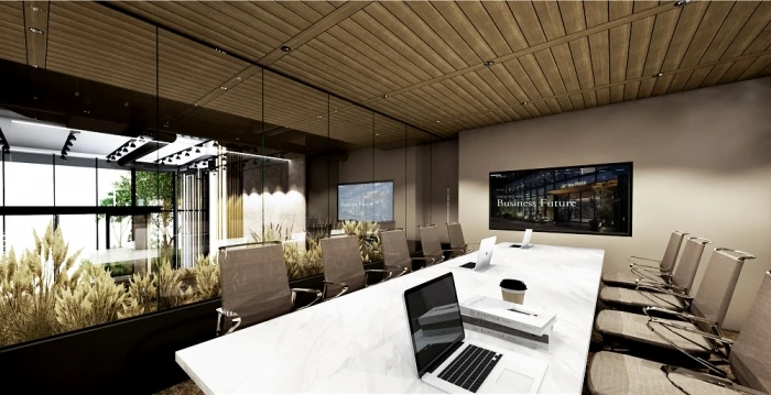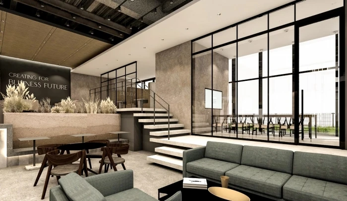 デザインコンセプトは『Villa(ヴィラ)』。“日常の中の非日常”を体感することを最大のゴールに、「その場所で体験できる価値」をいかにデザインの力で高めるかを軸に空間構成を行いました。“非日常”から導いたキーワード「ワーケーション」や「リゾート」をテーマに、1階ビジネスラウンジの壁面には地層を連想させるエイジング塗装を施し木目天井のディティールにもこだわりました。洗練され、知的創造性を高めるデザイン空間です。