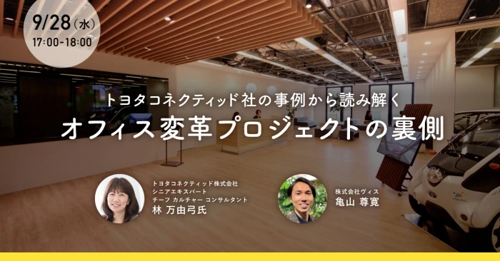 デザイナーズオフィスを手がけ、「はたらく」をデザインする株式会社ヴィス(本社:大阪市北区、代表取締役社長:金谷智浩)は、2022年9月28日(水)に無料セミナー「トヨタコネクティッド社の事例から読み解く オフィス変革プロジェクトの裏側」を、The Place Nagoya(名古屋市)とオンラインにて同時開催することをお知らせします。