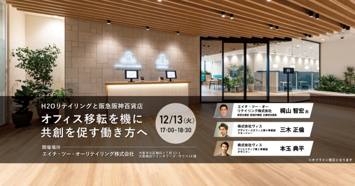 デザイナーズオフィスを手がけ、「はたらく」をデザインする株式会社ヴィス(本社:大阪市北区、代表取締役社長:金谷智浩)は、2022年12月13日(火)に、エイチ・ツー・オー リテイリング株式会社(以下 H2Oリテイリング)と共催で、オフィス移転プロジェクトを紹介するセミナーを開催することをお知らせします。会場はH2Oリテイリングの新オフィス(大阪市北区)で、参加者向けにオフィス見学会も実施します。
