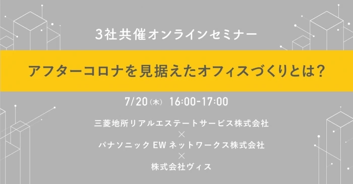 オフィスデザイン・ワークデザインを手がける株式会社ヴィス(本社:大阪市北区、代表取締役社長:金谷智浩、以下ヴィス)は、2023年7月20日に、三菱地所リアルエステートサービス株式会社、パナソニックEWネットワークス株式会社と共催で、「アフターコロナを見据えたオフィスづくりとは?」をテーマとするオンラインセミナーを開催することをお知らせします。