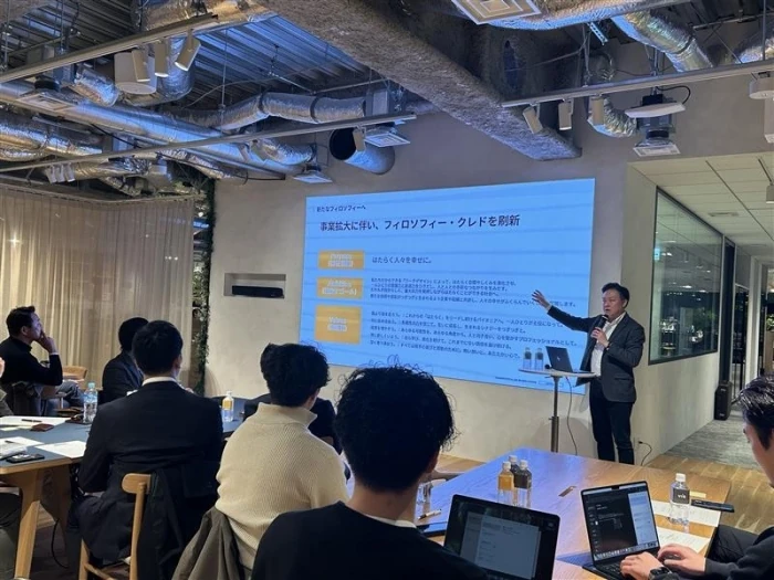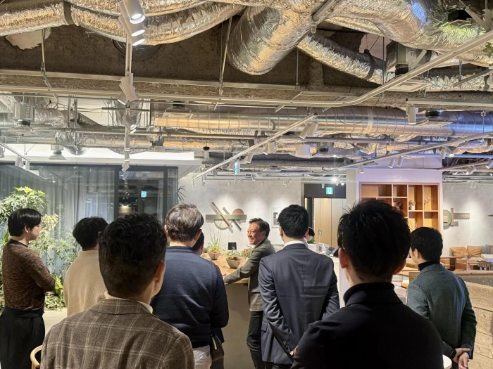 そんなレバレッジ倶楽部の第60例会となった今回は、当社東京オフィスにて開催となりました。金谷は「リーダーの挑戦-2020年東証M上場後、二代目代表のバトンを渡され、2030年度売上高250憶円を目指す。-」をテーマに、さまざまな話をさせていただき、講演後は、参加者の皆さんにオフィスツアーもご案内させていただきました。