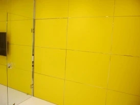 鏡面ステンレスを使用した造作受付カウンターは、鏡のように磨き上げる仕上げを施しています。