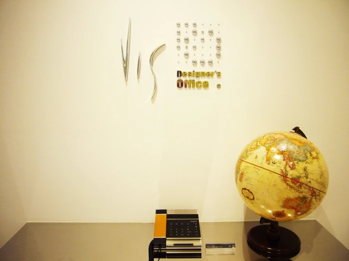 おなじみ『VIS』のサイン。毛筆で書かれたアルファベットは、フォルムが独特で、まさにオリジナルな私たちを象徴するものです。デザイナーズオフィスのロゴは大小4つの円形パーツからなり、特に小さいものは機械で制作不可能なサイズのため、仕上げは手作業というこだわりの逸品です。