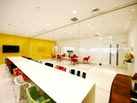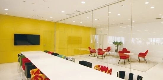 エントランスとワークスペースの間に会議室がありますが、どちらも間仕切りはガラスです。エントランス側には電動カーテンがあり、ワンタッチで開閉が可能です。表現したかったのは「ONとOFF」。お客様をお迎えするとき、会議のときなど、TPOに合わせて使い分けます。