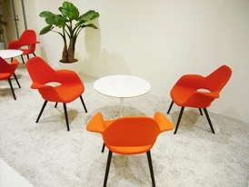 今回は、前大阪オフィスで使用していたチェアの張地を張替し、ほつれや傷んだ部分がキレイになって返ってきました。Marimekkoの鮮やかな色の大胆なプリント柄が、会議の気分を盛り上げます。