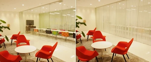 この時、解放感たっぷりの会議室も、一旦ベールを覆います。電動カーテンを採用しているので、シチュエーションに合わせて、臨機応変に会議室を見せることが可能です。