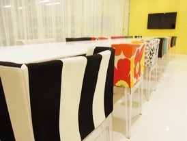 張地をマリメッコ柄に張り替えたカルテルのアームチェア「マドモワゼル」が、厳しくも楽しく学ぶ時間としての空間にづくりに一役買っています。