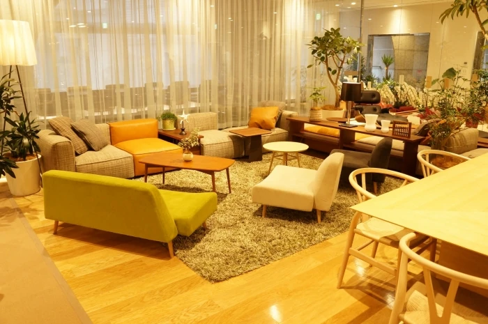 センターに用意されたグリーンが特徴的なオリジナルのテーブルもそうですし、さまざまなタイプの上質なソファセットでの仕事もまた違った感覚で仕事ができます。