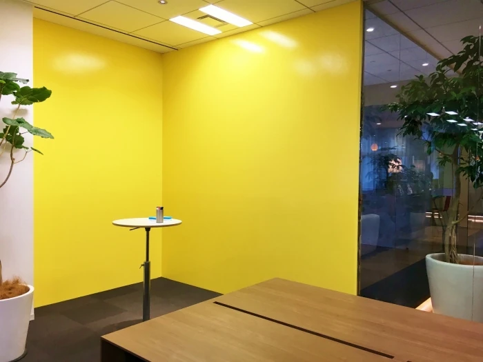 ちなみに黄色の壁の一角は、ホワイトボード仕様(実際はイエローボード仕様ですが)になっており、スタンディングミーティングをしながら思いついたことを書き留めたり、絵を描きながら説明したりすることができます。