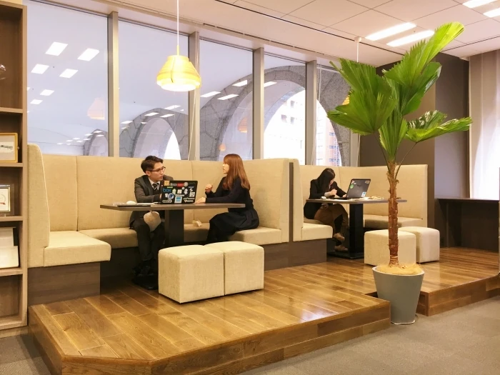 さらには、オフィスの各所にあるフリーのエリアでも仕事をすることができるので、自身のチームのデスクに荷物をおいてノートパソコンのみを持って移動するといったようなはたらき方が可能です。