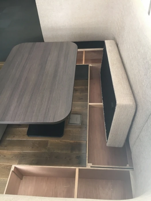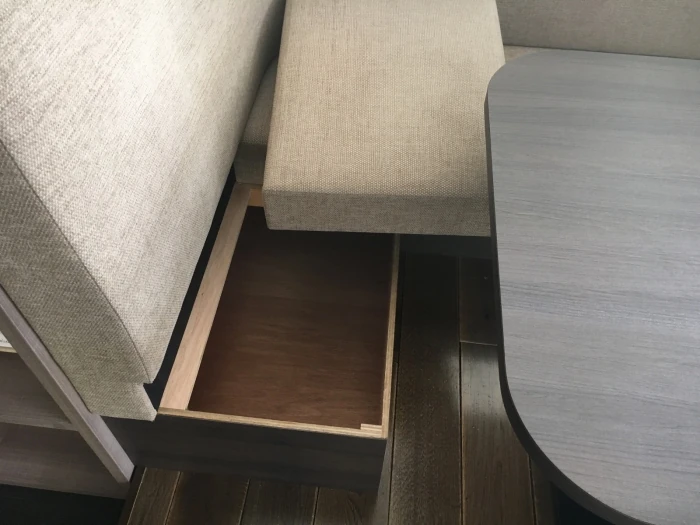 打合せスペースとしての使い勝手ももちろん抜群なのですが、なんとこのベンチソファ、こんな風に下が収納になっているのです!