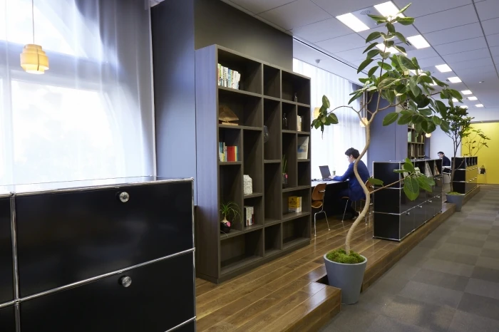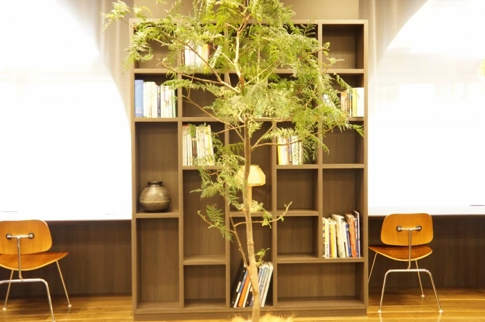 ”魅せる”収納というのは住宅インテリアでも憧れるものですが、オフィスインテリアでも人気があります。また造作で作り付けにすることによって場所や大きさに合わせてオリジナルで制作ができ、無駄のないダイナミックな収納にすることができます。