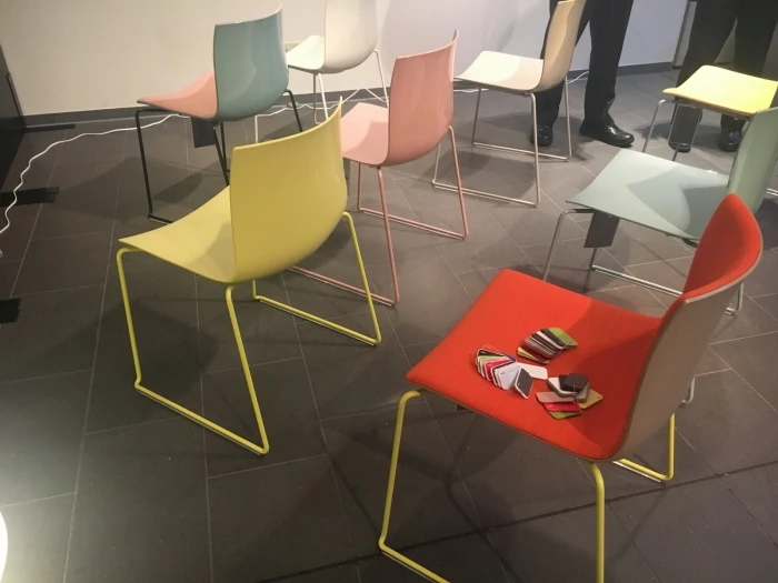 そして、すぐにでもオフィスに取り入れられる素敵なチェアが並んでいました。"arper”というブランドのチェアで、座面のクッション、背面、脚の色をカスタマイズすることができます。座面はクッションの有り無しも変更可能。