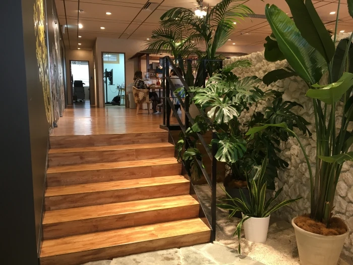 オフィス空間に一歩足を踏み入れた瞬間に見えるこの光景。やしの木、白い砂、石畳、白石壁・・・次第に心が解放され、あれ、私Hawaiiに来たんだっけ・・・?なんて想ってしまうほど、オフィスとは思えない完璧なHawaii空間が広がっていました。ビルの窓面もかなり大きいこともあり、外からの外光もたっぷり。室内にいるのに、外にいるような感覚になりました。ビル窓の大きさと採光、そして天井の高さがオフィス空間にこれほどまでに良い影響を与えるのか、と体感。大きい窓って改めて良いと思います。ちなみに、ノースショア様ではオフィスのことを『Beach』と呼んでいるのだそう。ユニークな文化。