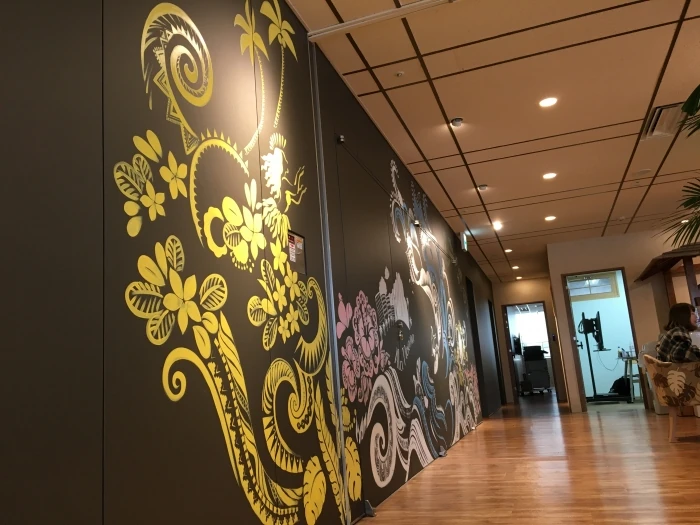 階段を上りきったところに目に入ったのは壁一面に描かれた絵。南国風の絵で見ているだけで心躍ります。実際にペイントデザイナーさんが描いてくださったそうですよ。最近壁に直接デザインペイントする案件が増えています。壁は空間の大部分を占めるので、どのような色・デザインにするのかで空間の印象を大きく左右させるんですよね。今までは壁紙の色・柄を変えることがスタンダードでしたが、ノースショア様のようにデザインペイントにすることで企業のオリジナリティが演出できるし、オンリーワンのものが出来るのでオススメです。そして、お気づきでしょうか。実はデザインペイントが施されている左側の壁はビルの既存壁なんです。通常は白色のスチール壁でスチール扉になっており、中にはパイプなどビル設備が格納されています。無機質になりがちなビルの元々の仕様も、デザインを加えると空間の演出になるんですよね。これがデザインの力。